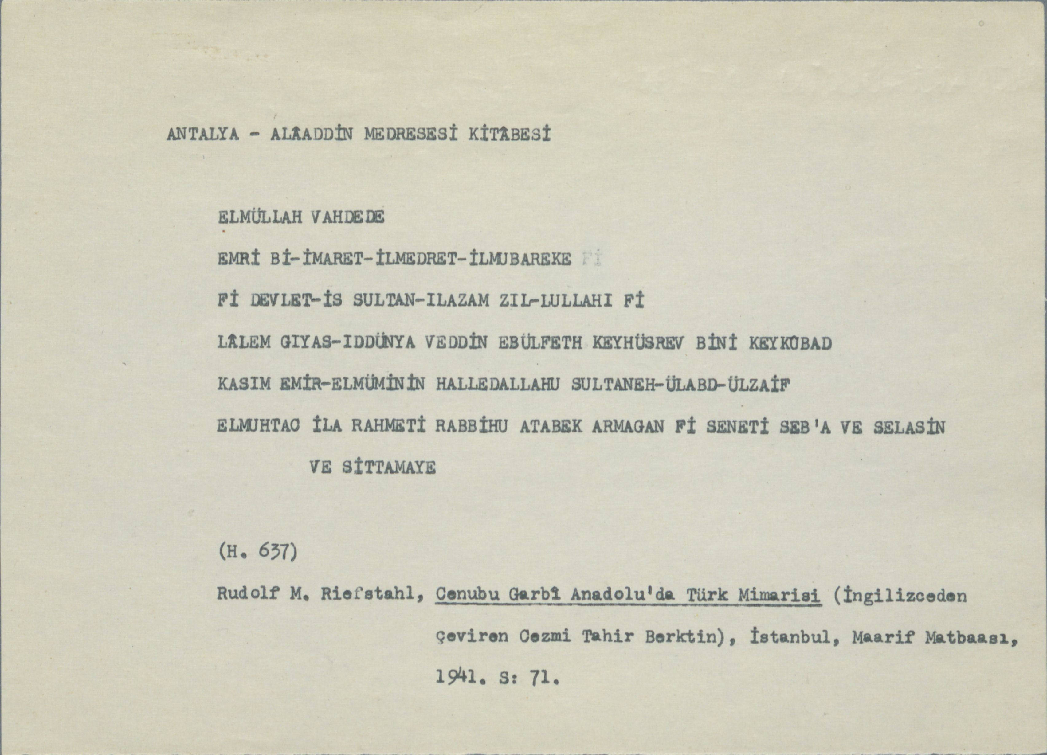 | dc.citation.english | Mübarizeddin Atabey Armağan Madrasa, Antalya, 1239 (H.637) . Aptullah Kuran Archive, Boğaziçi University Library Archive and Documentation Department, KRNARC01101001. | |