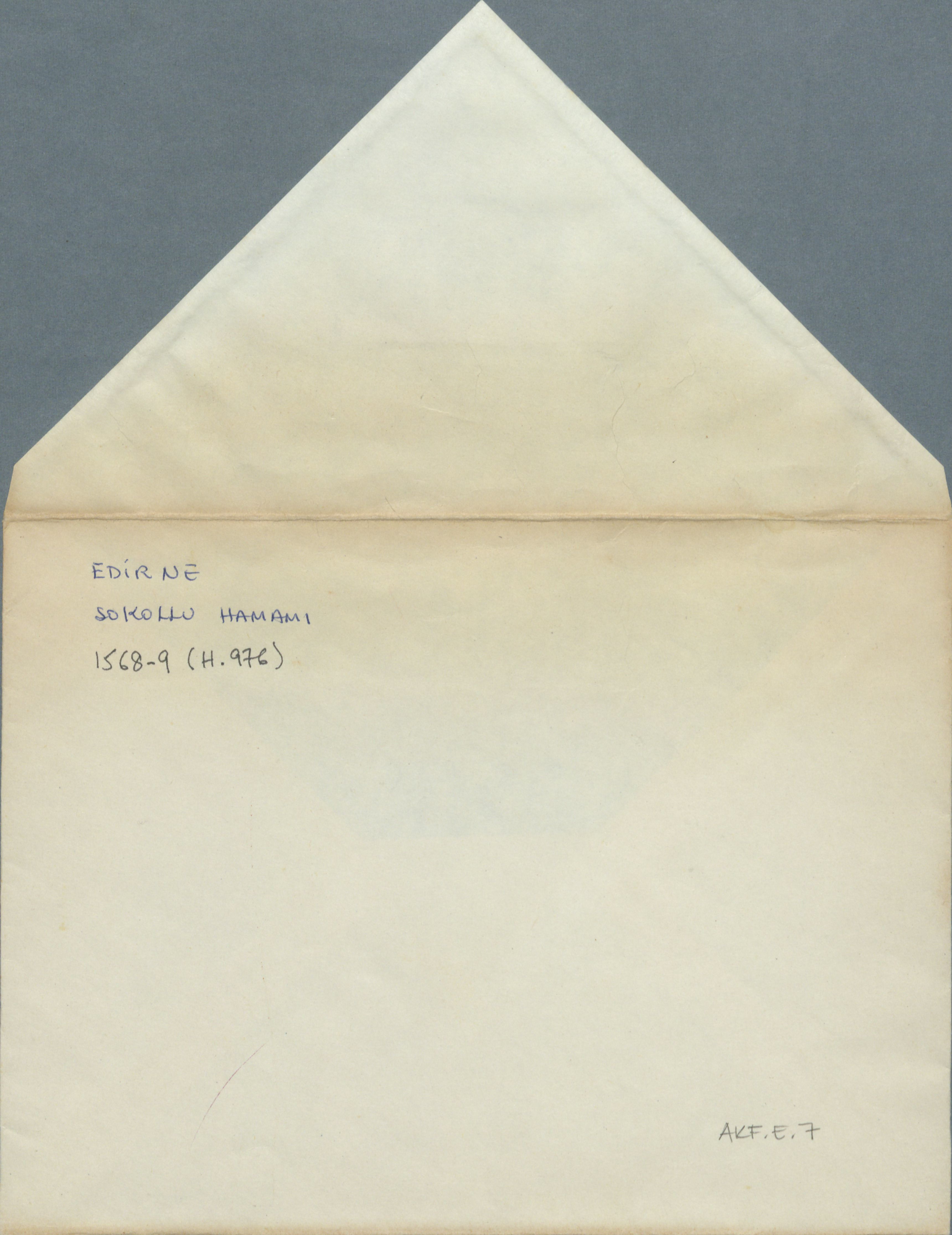 Çekmece 1 içerisinde üstünde "Edirne Sokollu Hamamı 1568-9 (H.976)" yazılı 8 fotoğraflı zarf