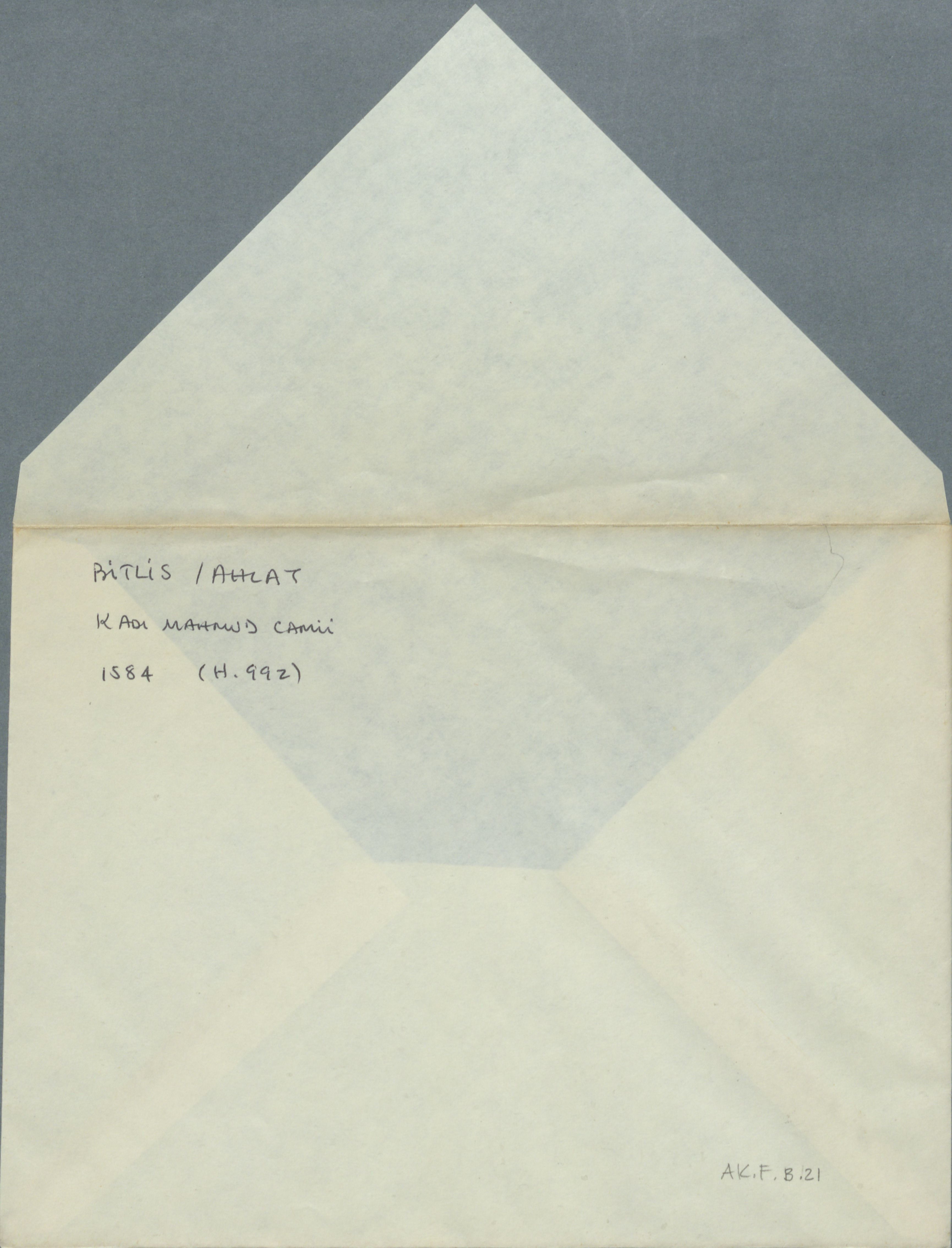 Çekmece 1 içerisinde üstünde "Bitlis/Ahlat Kadı Mahmud Camii 1584 (H.992)" yazılı 1 sayfa el yazılı zarf